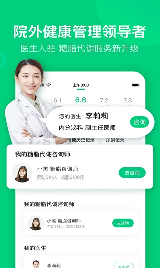 医生咨询:平台引入三甲医院专业医生团队,为用户提供血糖管理、科学减脂、抗衰老等领域的专业咨询服务,让用户足不出户就能获得权威的健康指导。