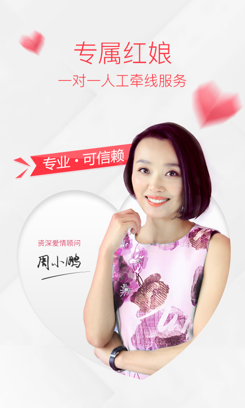 -智能推荐,红娘优选——基于用户画像和行为分析,系统精准推送匹配对象,专业红娘团队还会为您精选优质候选人,双重保障让您更快找到合适伴侣。