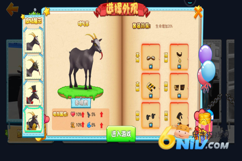 提供了多种风格各异的山羊角色,供玩家自由选择。每种山羊都拥有独特的外观和能力,比如喷气背包山羊可以翱翔天际,恶魔羊则能释放特殊技能。