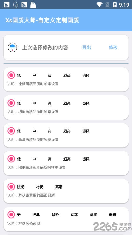 1. 智能画质优化:画质大师2.0通过先进的算法分析设备硬件性能,自动匹配最佳画质参数。玩家无需手动调整复杂设置,软件会根据GPU、CPU等硬件信息智能推荐高、中、低三档画质方案,确保游戏画面清晰流畅。