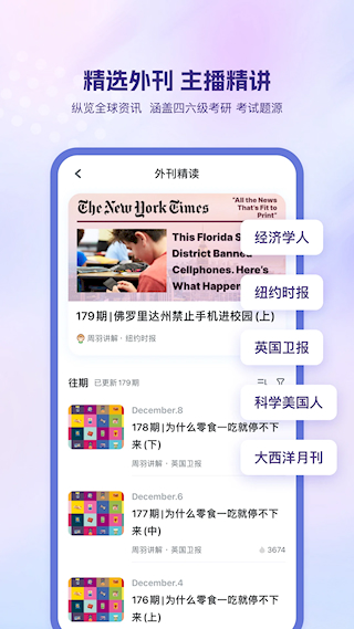 v4.9.50版本新增了播放界面的长难句解析功能,帮助用户更好地理解复杂句子结构。v4.9.18版本增加了海外日常口语板块,让学习内容更加实用;新增签到和补签功能,优化了首页今日更新功能。v4.8.4版本在文章中新增了真题单词标注功能,锁屏播放新增自定义背景图选项,同时优化了生词播放功能,使学习体验更加流畅。