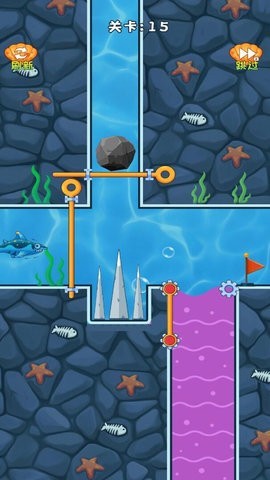 多样化的游戏角色:解锁的辅助角色包括能照亮黑暗区域的灯笼鱼、可冻结水流的冰霜海马。特定关卡需要合理搭配角色技能组合才能通关。