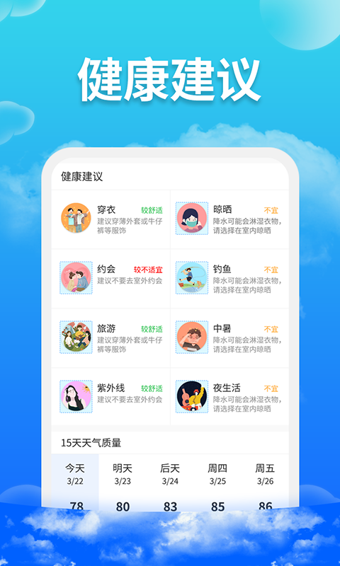 -健康建议:结合天气和空气质量,提供穿衣、运动等个性化健康指导