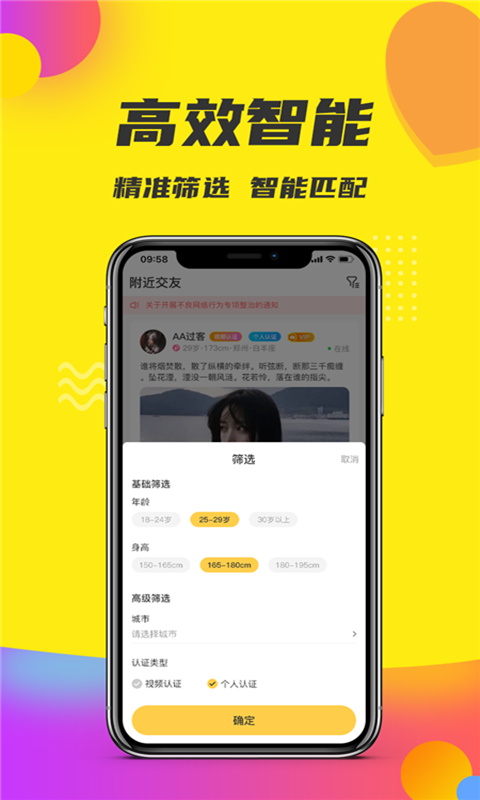 高效智能:采用先进算法进行精准筛选,智能匹配最适合你的社交对象;