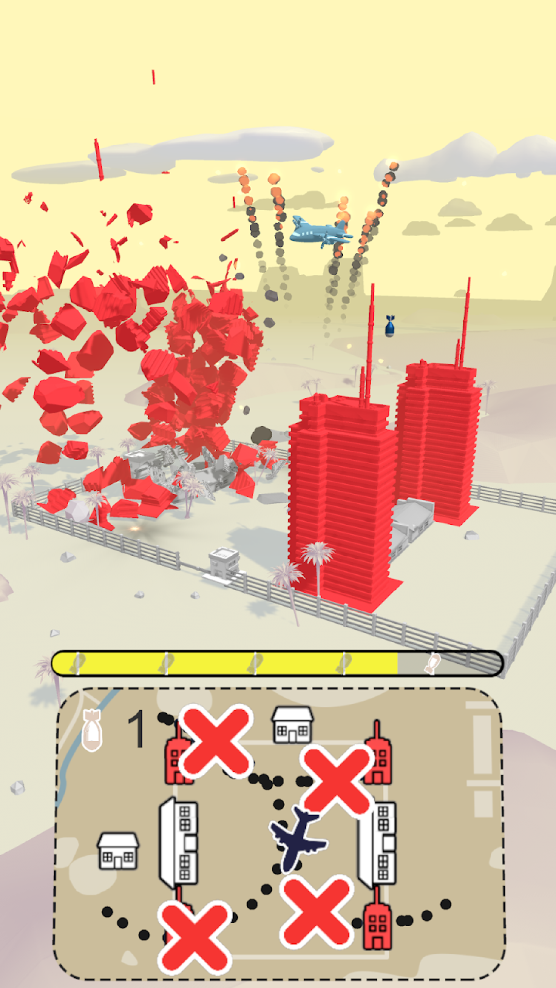 空袭城市游戏是一款极具破坏性与策略性的城市轰炸模拟游戏,玩家将化身王牌战机驾驶员,在逼真的3D场景中体验从高空投弹到地面爆破的全过程。游戏通过物理引擎真实还原爆炸冲击波对建筑物的摧毁效果,每发炮弹落下都会在地面留下触目惊心的弹坑,混凝土碎片与滚滚浓烟构成震撼的战争画卷。玩家需要精准操控B2隐形轰炸机等尖端战机,在枪林弹雨中完成一系列高难度空袭任务。