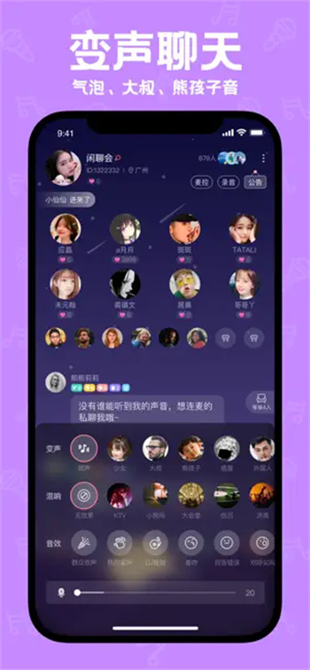 声鉴-声控语音聊天交友为用户提供了多样化的社交体验。用户可以自由出入各种语音直播间,与来自五湖四海的朋友畅聊。在聊天过程中,用户可以选择使用原声,也可以尝试各种有趣的语音包,比如女王音、少女音、御姐音、青年音、大叔音、气泡音、熊孩子音等,让聊天更加生动有趣。如果遇到特别喜欢的聊天室,用户可以关注主播账号,随时回访。此外,软件还支持查看房间成员详细信息,并可以私加好友,方便进一步交流。