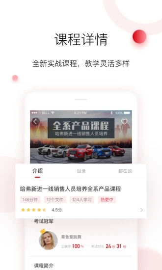 平台提供覆盖汽车行业15+岗位的定制化课程,涵盖胜任力、盈利力等核心能力维度。课程体系包含灵活的选课系统、配套试题及智能考核机制,确保学习效果可视化。车界大咖讲坛板块邀请行业领袖分享前沿见解,每月更新独家内容;名人访谈沙龙则以互动形式解析从业痛点,搭配案例拆解让知识更易吸收。此外,精彩集栏目通过混剪新闻热点与岗位知识点,让学习过程兼具趣味性与实用性,帮助用户在碎片时间高效提升。