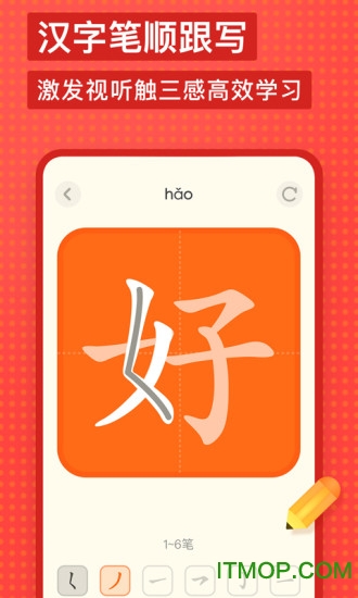 汉字笔顺:每个汉字都配有详细的笔顺动画和跟写练习,并收录真人发音,通过视觉、听觉和书写三方面结合,帮助孩子正确掌握汉字书写。