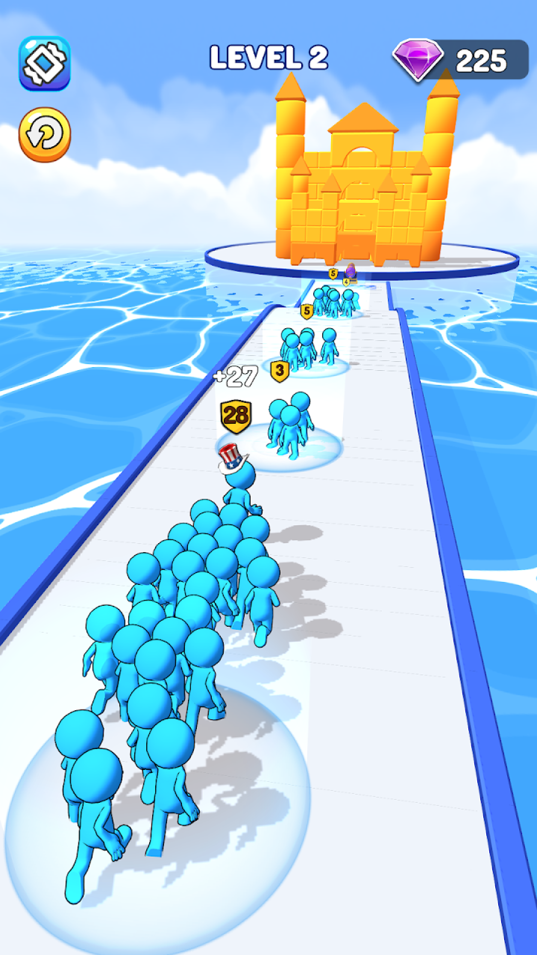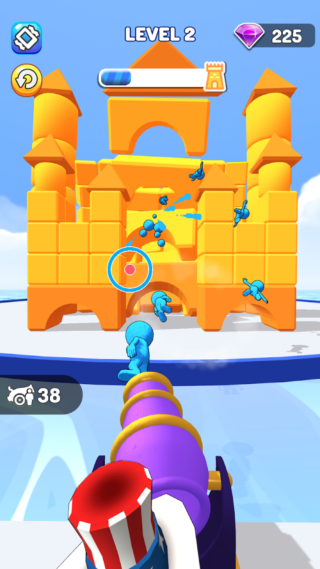 游戏核心在于精准预判与策略规划,移动的人群目标会随着关卡进度变换跑动轨迹。炮弹飞行过程受重力、风力等物理因素影响,高级关卡还需计算抛物线弹道。操作界面经过百万次测试优化,三指即可完成瞄准-蓄力-发射全流程。随着游戏深入,玩家将遇到会分列的人群方阵、突然加速的跑者等特殊目标,每个章节最后还有需要连续命中50+人的终极挑战。