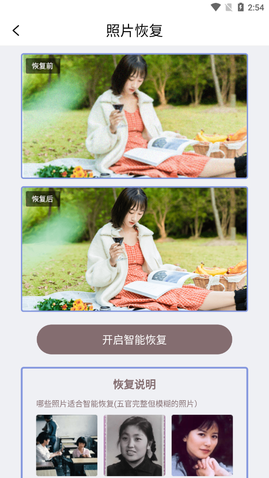 图像智能修复功能:对于那些因年代久远而变得模糊、褪色或破损的老照片,app能够自动识别照片中的各种缺陷,通过深度学习算法进行智能修复。该功能不仅能显著提高照片的清晰度,还能还原丰富的细节纹理,让老照片焕然一新,达到近乎完美的翻新效果。