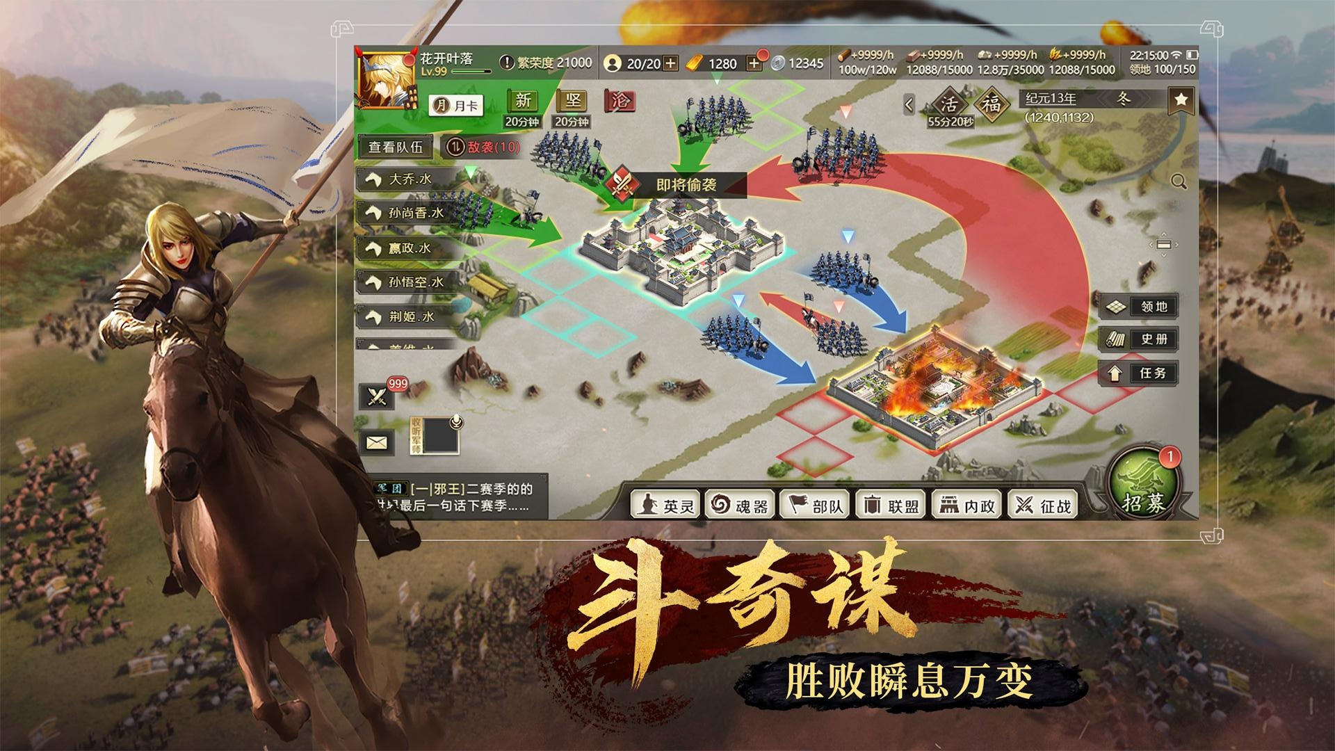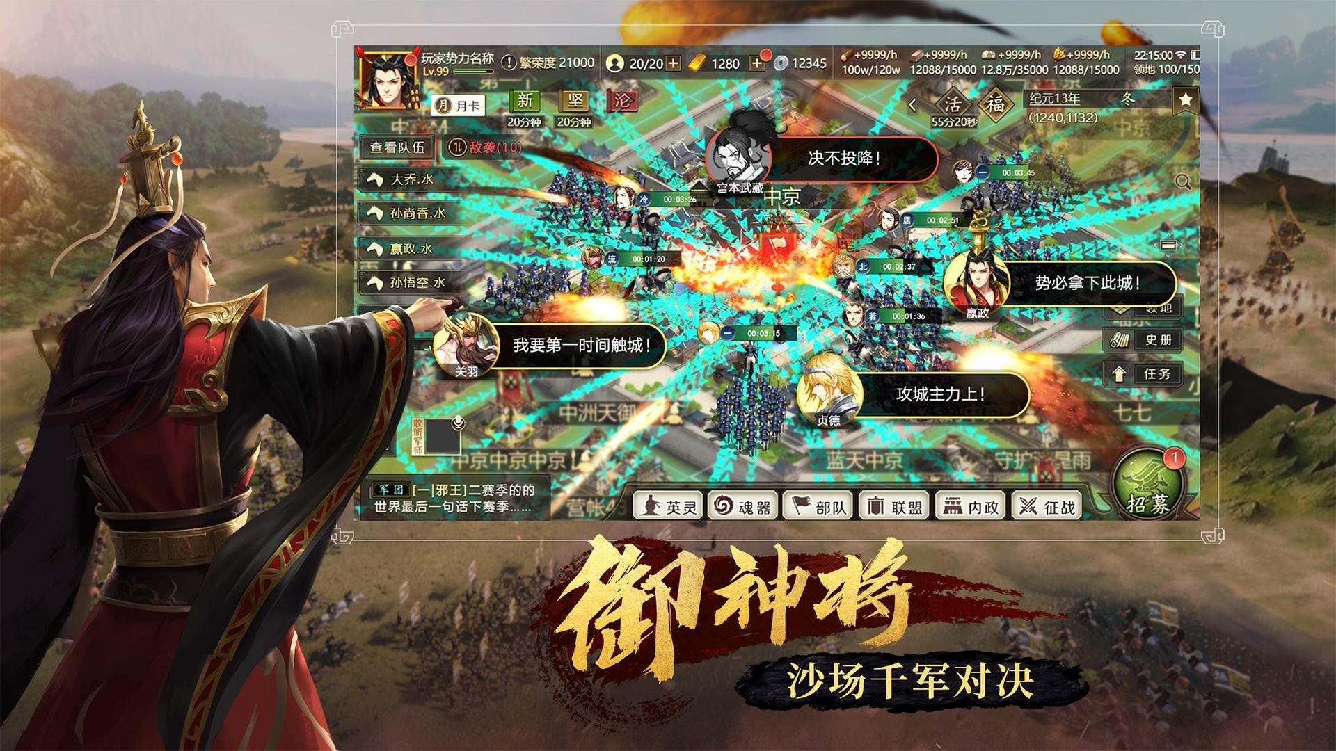 《全战天下》是一款充满热血与激情的战争策略手游,将玩家带入一个宏大的沙盘世界。游戏以真实历史为背景,集结了各个时代的英雄豪杰,在超过200万格可争夺的地块上展开激烈对抗。无论是排兵布阵还是实时对战,都能带给玩家极致的策略体验。精美的画面表现和震撼的技能特效,让每一场战斗都充满视觉冲击力。在这里,你可以培养军队、结交知己、提升官爵,体验从无名小卒到一方霸主的成长历程。