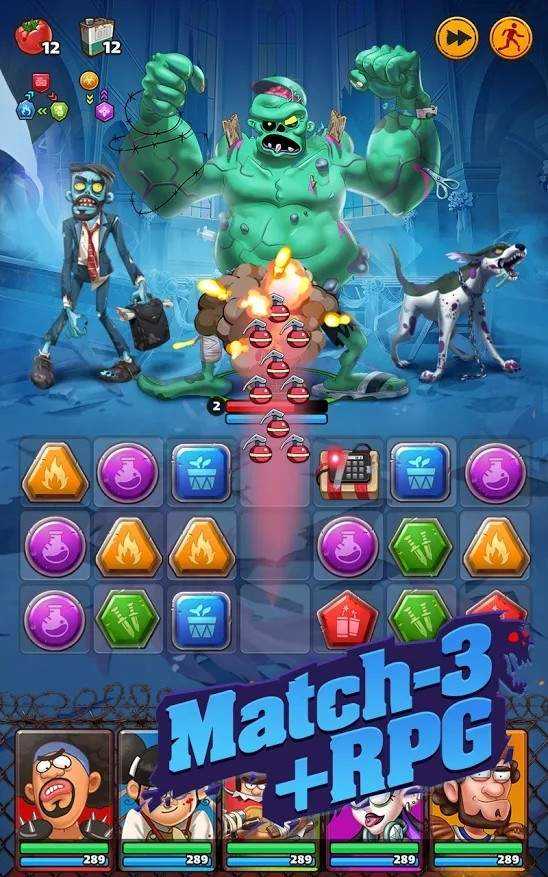 通过不断完成下面的棋盘消除挑战来触发不同的角色攻击,并通过这些角色的攻击来抵抗不断入侵的僵尸。