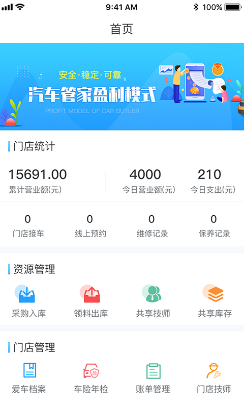 门店管理模块涵盖了爱车档案管理、车险车检提醒、账单管理、门店技师管理等实用功能,实现店铺各项业务的数字化管理。