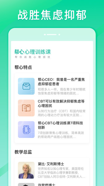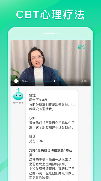 帮心心理是一款专注于大众心理健康服务的专业应用,致力于为用户提供个性化的心理治疗方案。平台汇聚了经验丰富的心理咨询师团队,通过科学的认知行为疗法(CBT)和创新的数字技术,帮助用户有效缓解焦虑、抑郁等情绪困扰。无论是日常压力疏导还是专业心理干预,用户都能在这里获得贴心的陪伴和专业的指导,逐步克服心理障碍,重获健康心态。