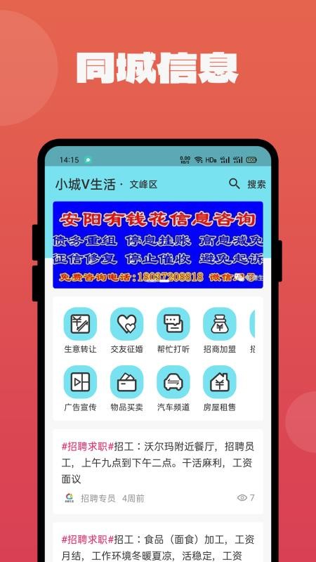 小城V生活app是一款专为本地居民打造的综合性生活服务平台,集求职招聘、房屋租赁、生活资讯等多元化功能于一体。通过智能分类和精准推荐,用户可以轻松获取周边最新、最实用的生活信息。无论是寻找心仪的工作、理想的住所,还是了解本地新鲜事,这款软件都能为您提供一站式解决方案。其简洁直观的界面设计和丰富的互动功能,让您的日常生活更加便捷高效,是提升生活品质的得力助手。