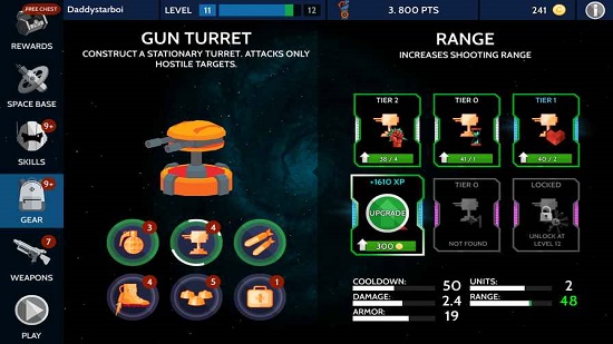 赢取战利品升级的武器和齿轮包括炮塔,步枪,放炮和地雷。新增量子纠缠炮和黑洞生成器等实验性武器,可通过分解重复装备获取强化材料。