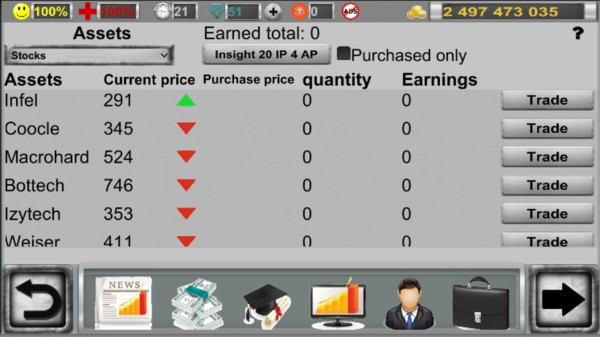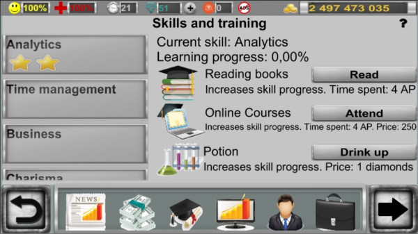 刚开始的时候你拥有的财富会比较少,你需要去经营好自己的公司才行,这样你才能到更多的金币完成挑战。游戏采用了渐进式的成长系统,初期资金有限,但通过明智的投资决策和商业运作,你可以逐步积累财富,最终成为虚拟世界的商业巨擘。