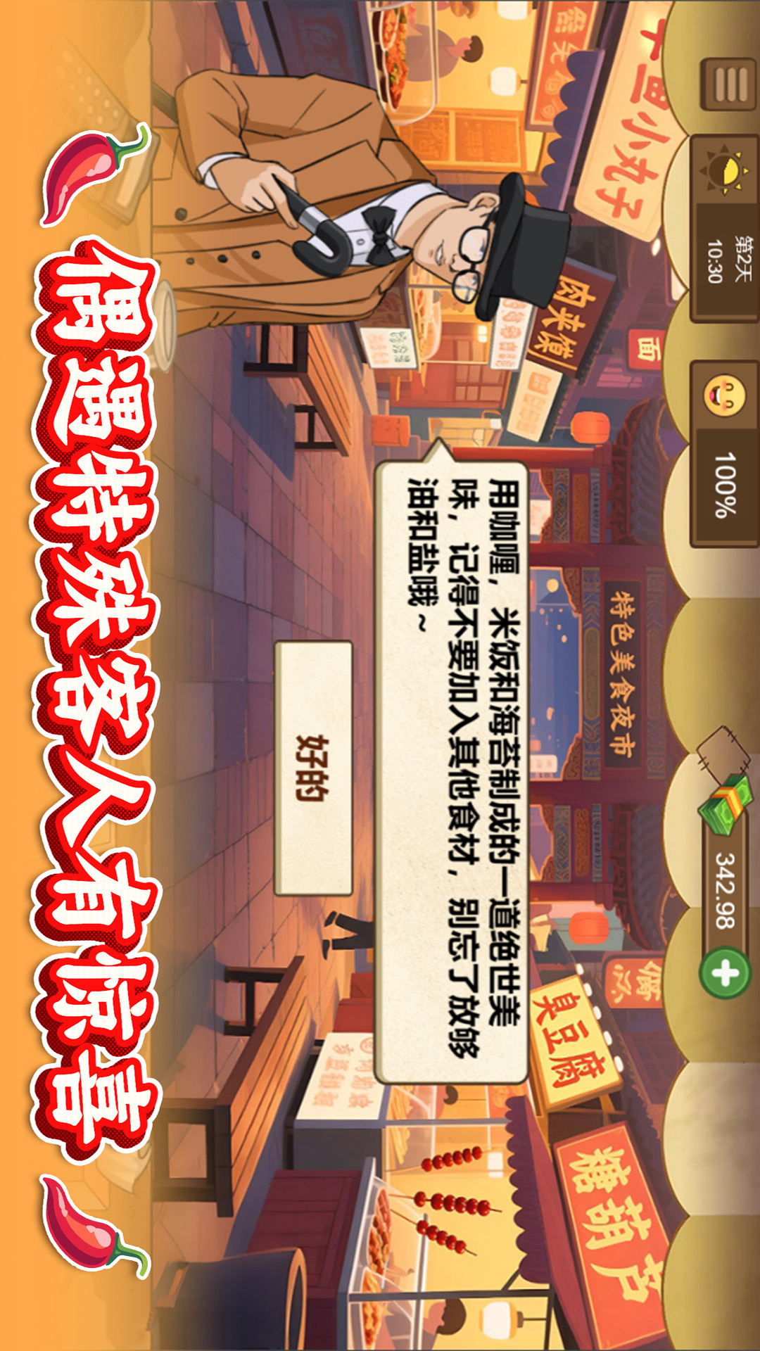 扩展性:支持玩家自定义摊位装饰和员工服装,打造独一无二的美食品牌。