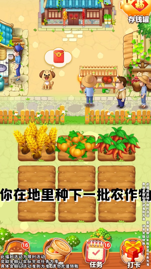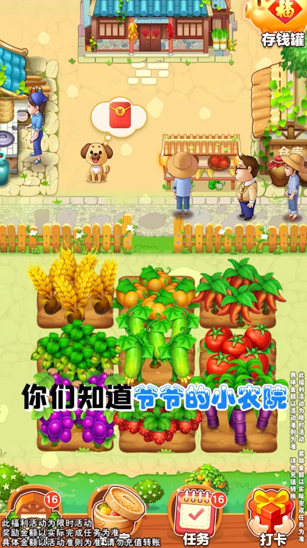 开心小农院是一款充满田园风情的休闲模拟经营手游,在这里你可以体验种植农作物、培育花卉、喂养宠物的乐趣,享受轻松惬意的农场生活。游戏采用简单易上手的点击放置合成玩法,只需轻轻一点就能完成各种操作。每次收获都能获得丰厚奖励,通过观看视频或分享游戏还能赢取额外大奖。最令人惊喜的是,游戏支持每日无限制提现功能,让你在享受游戏乐趣的同时还能获得真实收益。