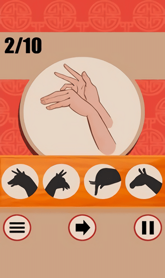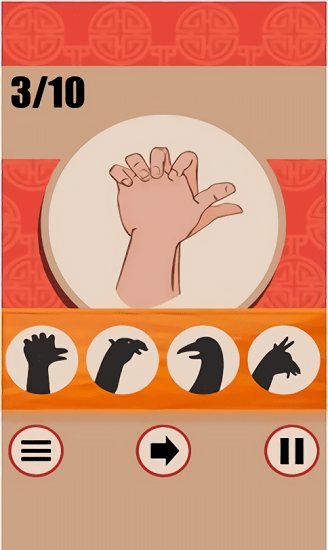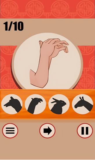 皮影艺术是一款充满传统文化韵味的创意猜谜游戏。在游戏中,玩家需要通过观察各种经典的皮影手势造型,来猜测它们所代表的形象或物品。这款游戏不仅能让玩家重温童年观看皮影戏的美好回忆,还能学习到许多有趣的皮影手势技巧。这些手势知识在日常生活中也能派上用场,比如用于肢体语言表达或即兴表演。游戏将传统艺术与现代玩法完美结合,让玩家在娱乐中感受中华文化的独特魅力。