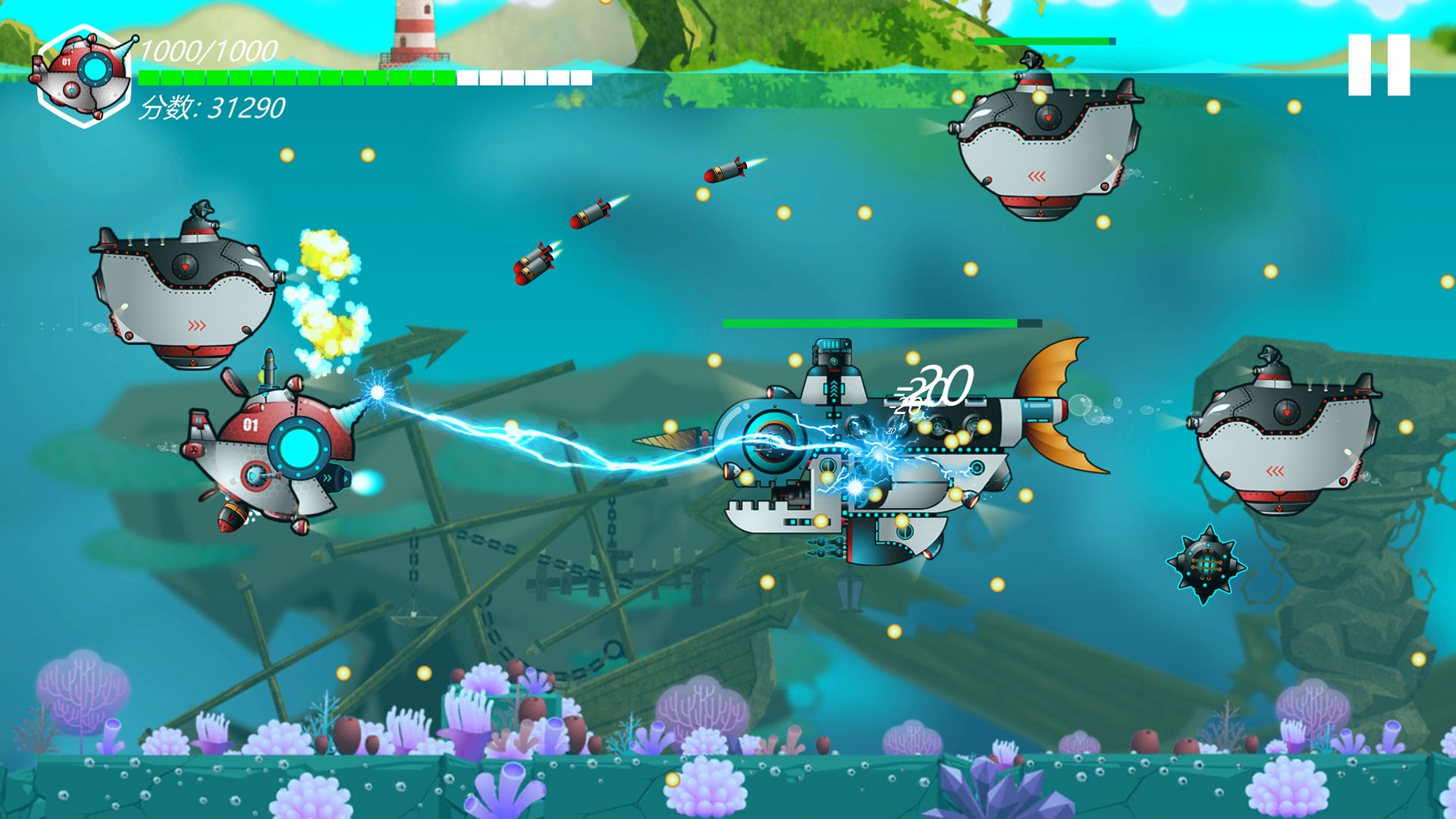 玩家通过操作潜水艇消灭水里的各种动物,潜水艇拥有两种子弹,很耐玩很有挑战性!本游戏包含30个惊险的关卡,让您和好友度过愉快的时间。敌人的水下暗礁堡垒,偶尔水下生物的突然袭击将为你带来致命的危险。游戏采用双摇杆操作方式,左侧控制移动,右侧控制射击方向,简单直观。随着关卡的推进,敌人会变得越来越强大,玩家需要灵活运用潜艇的两种子弹和收集到的BUFF来应对不同的战斗场景。