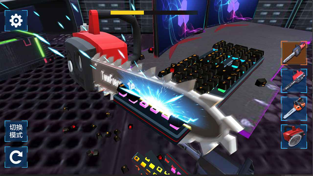 游戏提供了丰富多样的破坏方式,满足不同玩家的发泄需求。你可以用手指将键盘按键一个个抠出来,看着它们像天女散花般飞向空中;也可以选择重锤模式,用钢铁拳头将键盘砸得粉碎;更有趣的是摔打模式,你可以将键盘高高举起再狠狠摔下,体验那种痛快淋漓的感觉。此外,游戏还配备了多种破坏工具,包括棒球棍、电锯、激光等,每一种工具都会带来独特的破坏效果。最特别的是绘画模式,你可以用激光在键盘上"作画",创造出属于自己的破坏艺术。