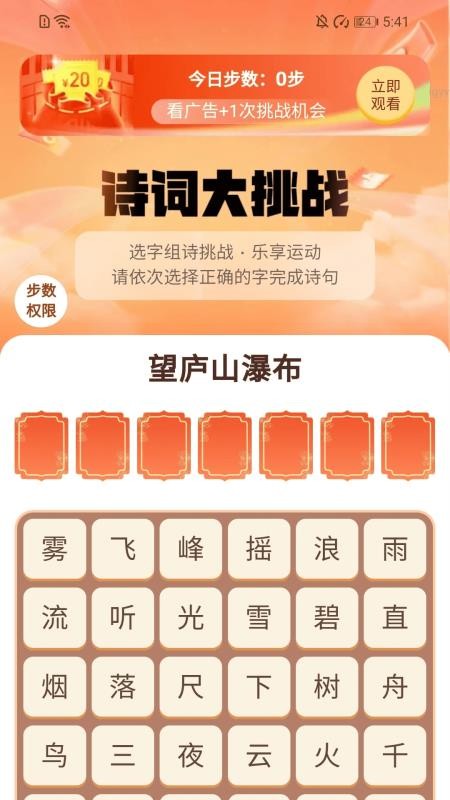 首次使用需要开启步数权限,系统会自动开始记录运动数据;用户可以在首页查看当天的运动步数和历史记录;参与诗词挑战时,系统会随机提供汉字,用户需要从中选择正确的字组成完整诗句;每日签到可以获得额外奖励,连续签到奖励更丰厚;所有收益都可以随时提现,支持多种主流支付方式。