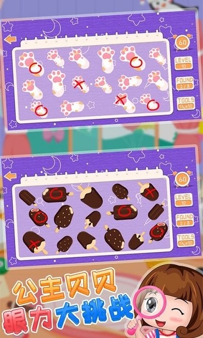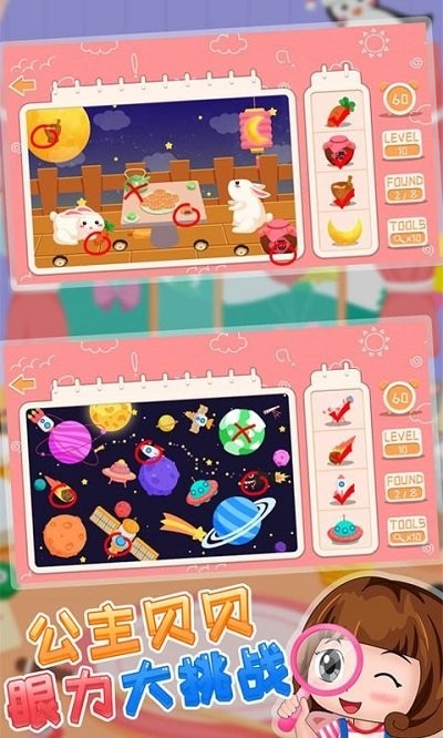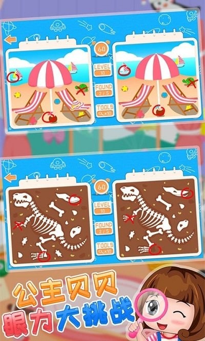公主贝贝眼力大挑战安卓版是一款专为儿童打造的益智游戏,旨在通过趣味性的找不同玩法训练孩子的专注力和观察力。游戏中的每一张图片都经过精心设计,画面生动有趣,能够吸引孩子的注意力。在游戏过程中,孩子们需要仔细观察图片的每一个细节,找出其中的不同之处,这不仅能够锻炼他们的眼力,还能培养他们的逻辑思维能力和解决问题的能力。游戏支持亲子互动模式,家长可以陪伴孩子一起玩耍,共同完成挑战,增进亲子感情。通过不同类型的图片找不同,游戏还能激发孩子们的好奇心和探索欲望,让他们在玩耍中学习到更多知识。