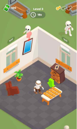 窗户封一次是不行的,僵尸也会打破木板的,所以窗户需要封两次;这个独特的设定让游戏更具策略深度,你需要权衡资源消耗和防御效果。只有窗户能力到达100%时,才能更好的防御僵尸,保护好自己;游戏引入了完善的升级系统,可以提升封窗速度和防御强度。千万不能让僵尸进入房子里,不然自己将会闯关失败,做好封窗作战。游戏还设有多种特殊道具和陷阱,让你在面对僵尸潮时能有更多应对手段。