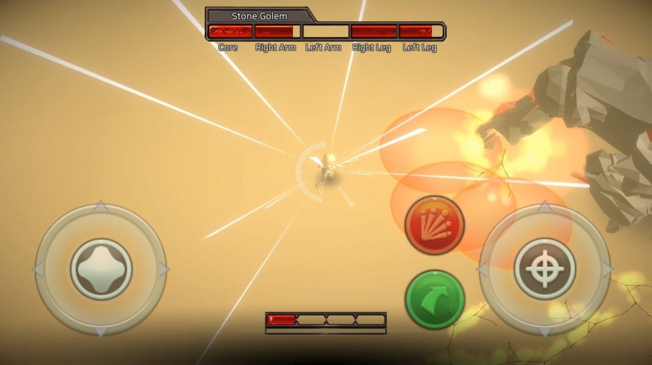 游戏中提供了多种武器装备供玩家选择,每种武器都有其独特的使用方式和效果。玩家需要充分发挥这些装备的优势来展现自己的实力,同时要善用绿色按钮来躲避敌人的攻击。游戏中的战斗体验非常刺激,一旦生命值耗尽就必须重新开始挑战。右侧的虚拟摇杆不仅控制瞄准和射击,还能在关键时刻发动闪避或致命攻击。游戏的整体节奏紧凑,画面表现力出色,为玩家带来了极具沉浸感的冒险体验。