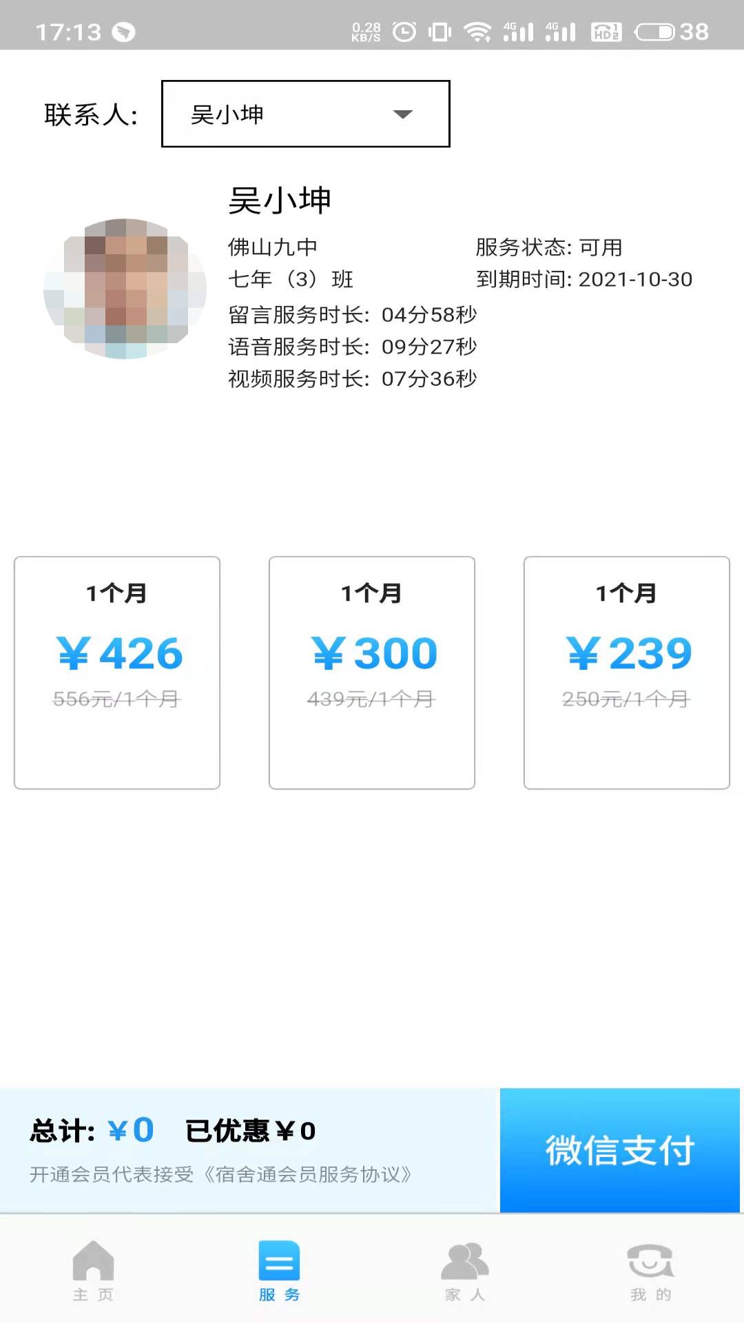 服务页是家长为孩子购买增值服务的专属区域。在这里,家长可以为当前绑定的学生联系人购买可视对讲服务。购买成功后,系统会立即刷新显示状态,家长便可立即使用该服务与孩子进行视频通话。服务页还提供详细的套餐说明和购买指南,帮助家长选择最适合的服务方案。