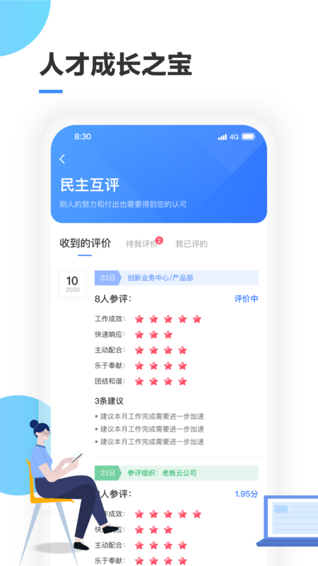 每月考评功能由直接领导和同事根据共享的月清内容进行匿名互评,评分结果将纳入月度绩效考核。这种机制确保评价客观公正,同时强化绩效管理的透明度。