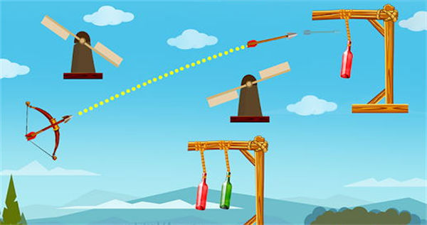 调整射击的角度和力度,让你的子弹或者弓箭击中瓶子,这需要玩家精准计算弹道轨迹和重力影响。有障碍物的时候我们要先处理障碍物才能射击到瓶子,有些障碍物可以直接击碎,有些则需要寻找特殊方法才能清除。有很多机关是可以触发的,让我们事半功倍完成任务,比如可以激活传送带改变瓶子位置,或是启动风扇改变子弹飞行方向,这些互动元素大大增加了游戏的可玩性。