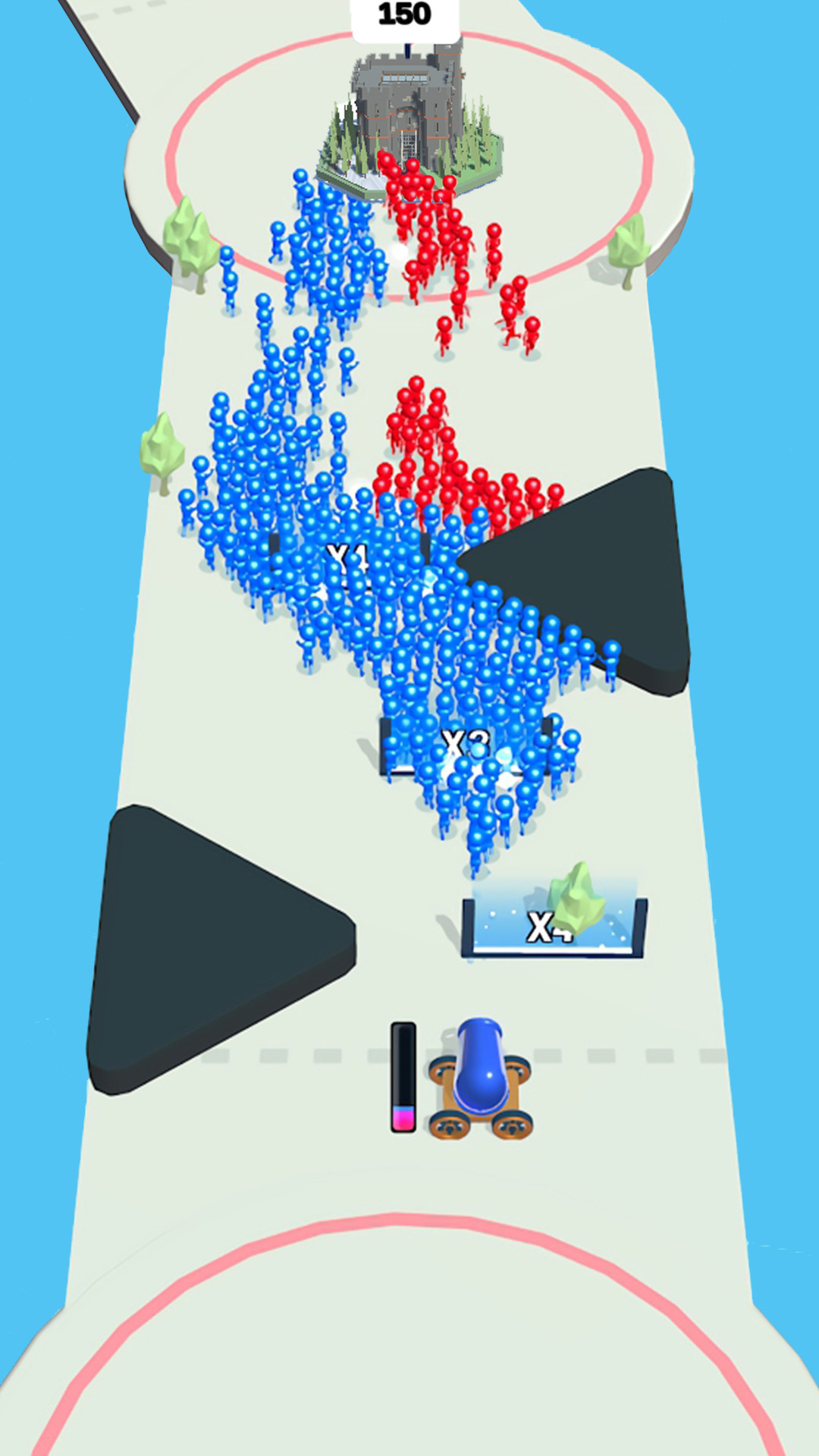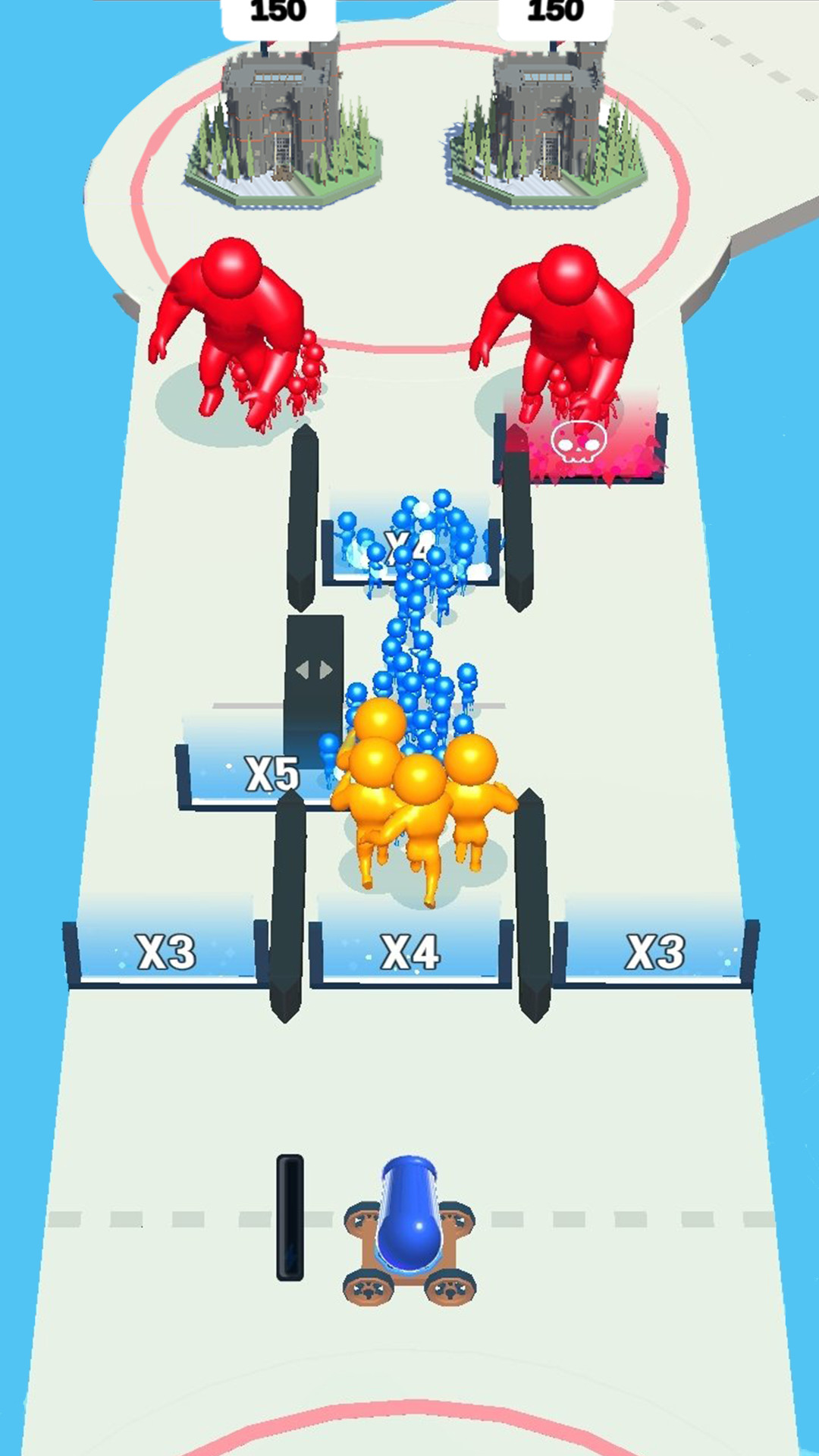 玩家通过点击屏幕控制大炮发射角度和力度,将火柴人士兵精准射向目标区域。游戏中的倍增大门是关键要素,穿过大门的士兵会成倍增加,快速壮大队伍规模。操作方式简单直观,但需要玩家掌握物理弹道特性。战斗中要时刻注意敌方动向,及时调整防御部署。游戏采用即时对抗模式,蓝色方和红色方会同时行动,玩家必须在动态战场中把握最佳时机发动进攻。胜利条件是消灭所有敌方单位或占领对方营地。