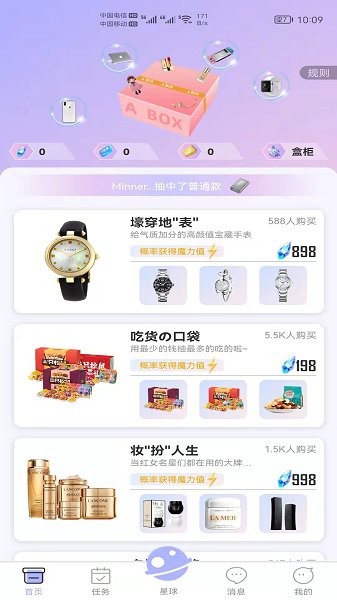 1.实时选盒功能让用户随时查看最新上架的盲盒,多种优惠活动同步进行,开盒后立即显示结果,实现即买即拆的畅快体验