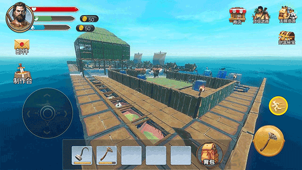 在《海贼世纪大冒险》中,玩家需要徒手收集散落在海滩和地图各处的资源,这些基础材料是生存的关键。随着游戏进程,你可以制作各种工具来提升采集效率,比如用石斧砍伐树木会比徒手快得多。营地建设系统让你可以打造属于自己的生存基地,从简单的篝火到功能齐全的工作台,每项升级都能带来新的生存可能。游戏中的生存指标系统非常细致,你需要时刻关注饱食度、口渴度和生命值,合理分配资源才能走得更远。最令人期待的是船只建造系统,只有不断升级帆船才能解锁新的海域和岛屿,获得更丰富的物资。当你的帆船达到一定等级时,就能通过岛屿左侧的绿色传送门前往未知的新世界。