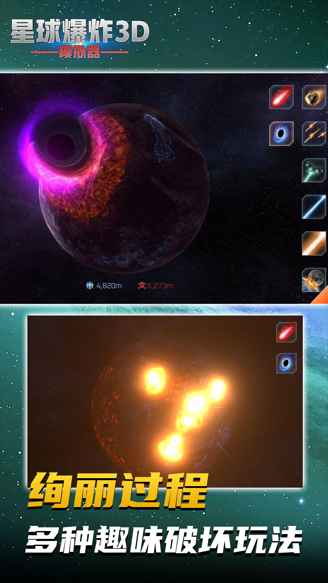 游戏收录了超过50种形态各异的行星,包括冰封星球、气态巨行星等特殊类型。操作方式简单直观,通过触屏就能完成瞄准、发射等动作。创新的积分系统鼓励玩家创造更华丽的爆炸效果,连续破坏还能触发特殊奖励。玩家可以操控轨道激光炮、引力波发射器等科幻武器,也能召唤陨石雨等自然力量。独特的卫星视角功能,让你能360度欣赏星球从完整到粉碎的全过程,熔岩流动与地壳龟裂的细节令人叹为观止。
