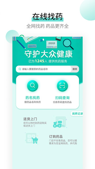 整合全国药品资源数据库,支持按药品名称、功效等条件智能搜索,帮助用户快速找到所需药品,并提供附近药房库存查询服务。