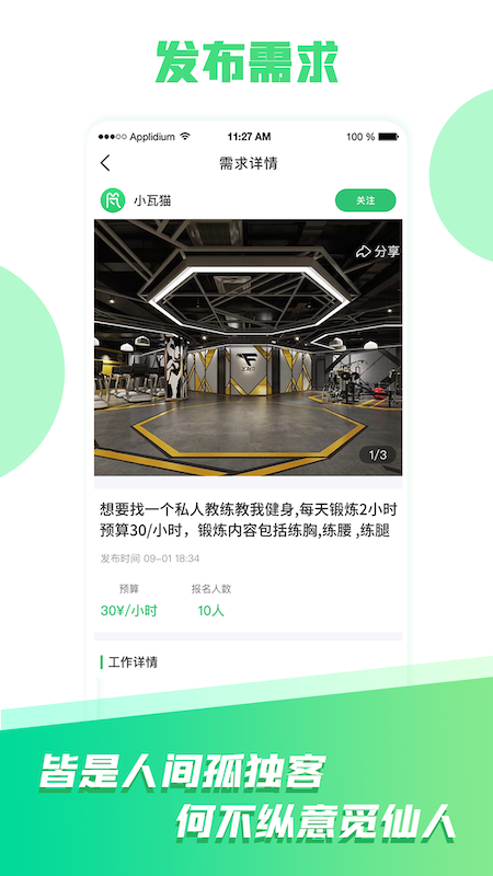 "皆是人间孤,何不纵意觅仙人"。当您遇到棘手问题时,只需在小瓦猫发布详细需求,系统就会智能推送给相关领域的达人。从家居维修到学业辅导,从商务咨询到旅行规划,各类需求都能得到快速响应。需求发布支持多维度筛选条件设置,确保匹配到最合适的服务提供者。平台还提供担保交易和评价系统,让每一次求助都安全可靠,让您真正感受到"不是一个人在战斗"的温暖。