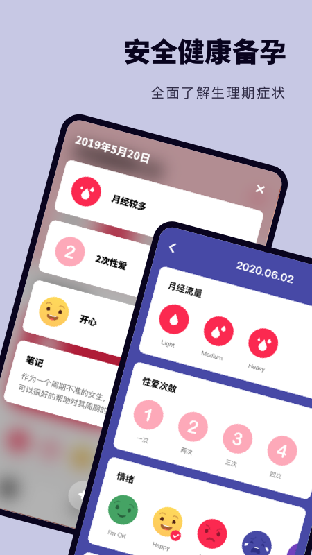 3、详细记录女性生理期内的身体状况,关爱女性健康,让准妈妈们安全健康地备孕。支持记录基础体温、宫颈粘液、乳房胀痛等20多项体征指标,形成完整的健康档案。