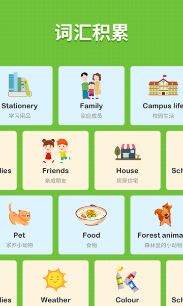 【词汇积累】软件精心整理了67类实用英语词汇,涵盖日常生活、校园学习、自然科普等多个主题。每个词汇都配有生动的图片、标准发音和实用例句,帮助孩子在语境中记忆单词。创新的记忆曲线算法会根据孩子的掌握情况智能安排复习时间,确保学习效果。家长还可以自定义单词本,针对性地强化重点词汇的学习。