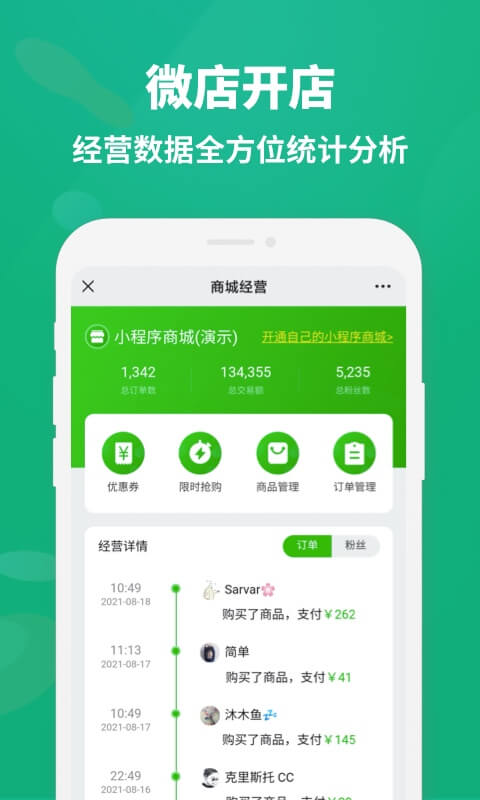 1.、小程序商城卖货、产品展示分分钟影响用户下单!微店助手正是针对商家与客户交易路径,让商家用户可以通过微信、小程序60秒中每1秒都可以查看客户下单的交易数据,系统会自动生成可视化报表,帮助商家快速识别热销商品和潜在爆款。通过智能算法分析用户浏览路径和购买习惯,为精准营销提供数据支持。