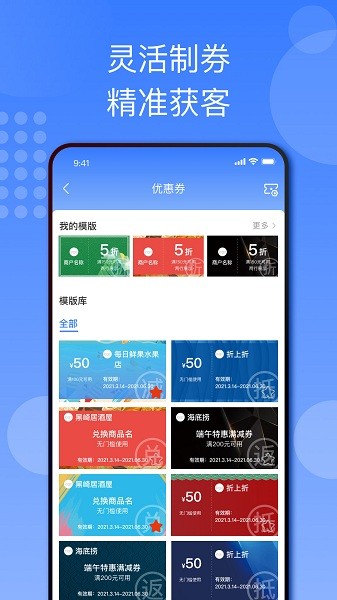 设置有折扣券模板,抵现券模板,满减券模板等各种专业的模板。商户可以根据自身需求快速创建营销活动,无需复杂设计。