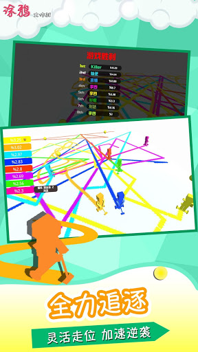 游戏的核心玩法是占领更多画布空间。通过灵活走位,你需要不断覆盖对手的涂鸦轨迹,同时保护自己的领地。游戏中的小圆点是关键资源,吃掉它们可以提升移动速度。长时间未获取资源会导致速度下降,这时要格外小心对手的进攻。