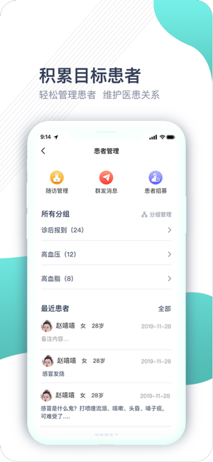 4、患者管理:提供智能化的患者分组管理工具,支持按病种、治疗阶段等多维度分类,可批量发送随访提醒、健康指导等信息。历史问诊记录、用药情况等数据可视化呈现,助力医生建立完整的患者健康档案。