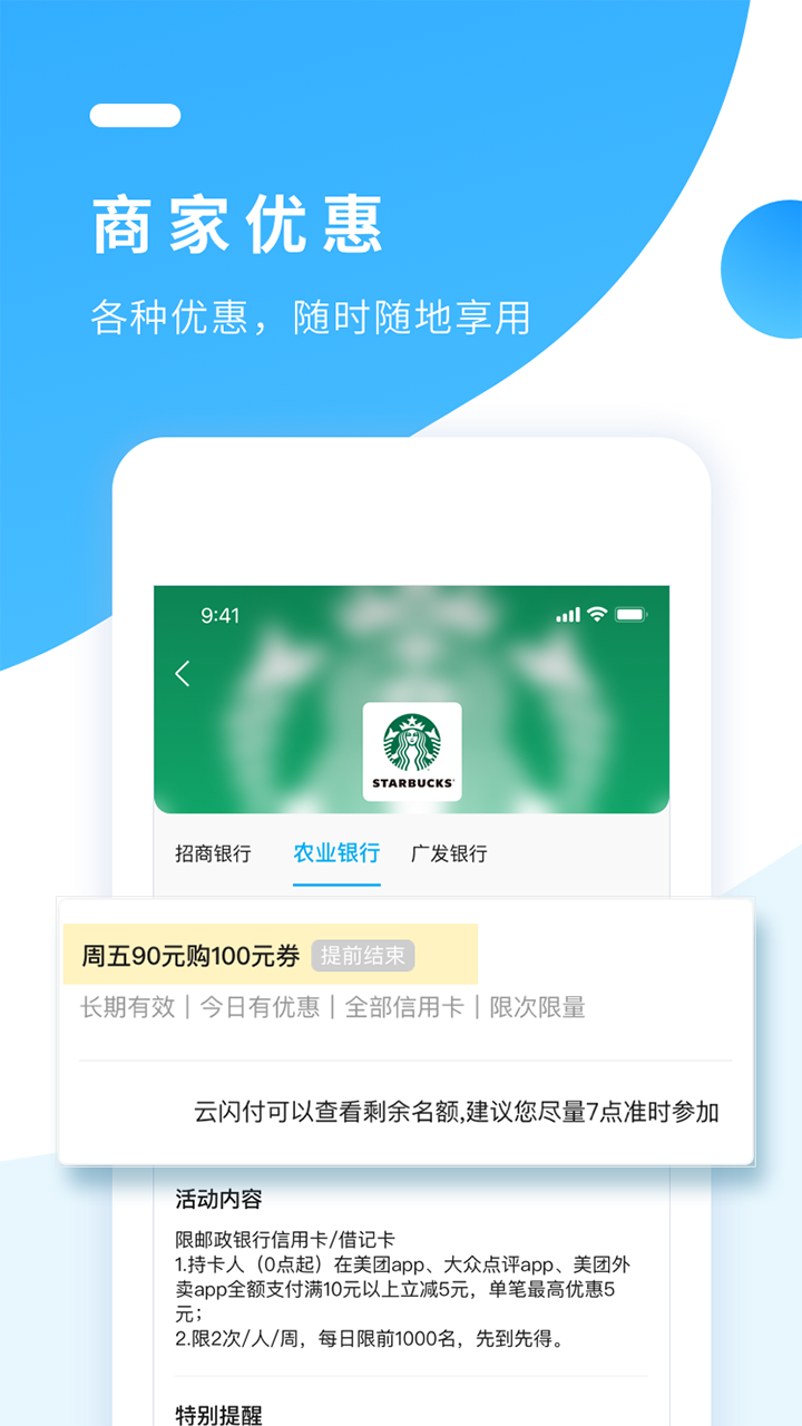 商家优惠:覆盖餐饮、购物、出行等多个消费场景,汇集海量商家折扣信息,让您随时随地享受超值优惠。