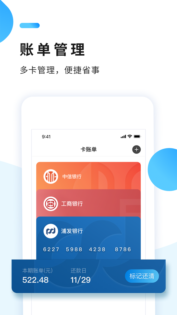 账单管理:支持多张信用卡的统一管理,智能提醒还款日期,自动生成消费分析报表,让财务管理更加清晰便捷。