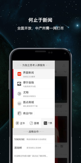 左侧菜单全新改版,整合了摩尔金融、界面之选、T界等多项服务,实现投资、电商、活动全覆盖。个人中心整体迁移至右侧菜单,布局更加符合用户习惯。部分频道新增顶部轮播功能,重要内容展示更加突出。同时优化了评论回复等交互细节,提升了用户体验。