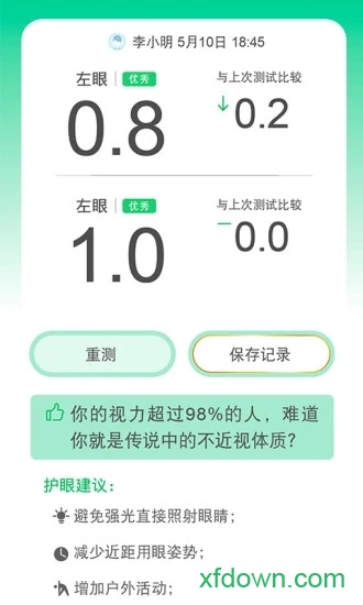 2、智能对比算法能发现0.1度的视力变化,自动生成可视化趋势图表和健康建议