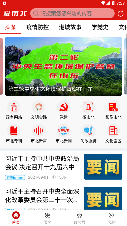 1、打开爱市北软件后,首页清晰展示了政务网站、文明实践、党建、文化强区等核心功能入口,方便用户快速定位所需服务;